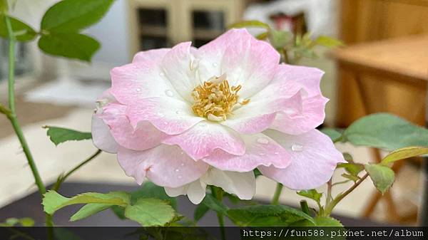 別名:杏花村分類:中國薔薇/迷你玫瑰花型:圓瓣平開/單瓣/顏色:白色的花心,外圍剛開時是彩度很高的粉紅色,快花謝時是淺粉紅色